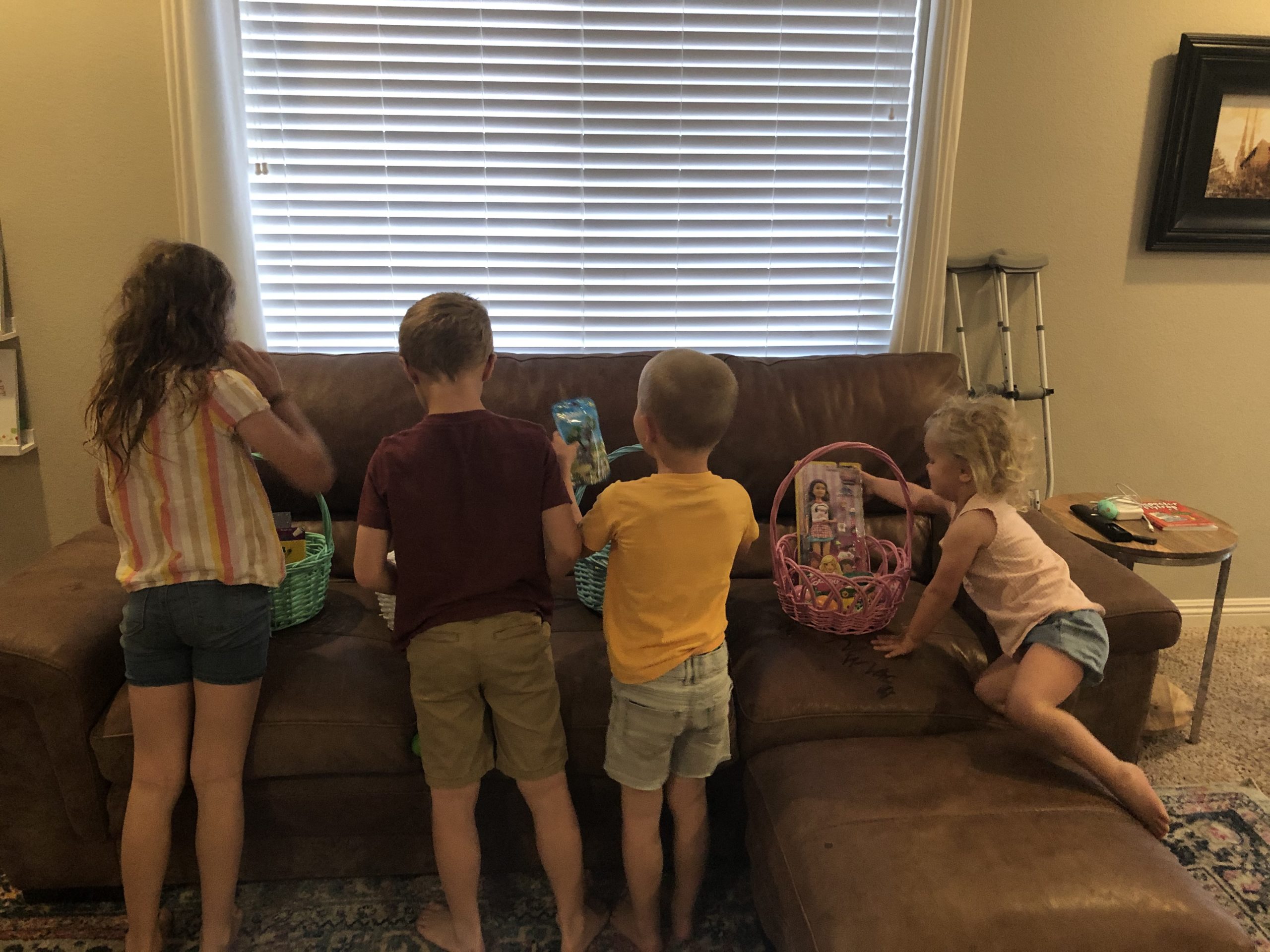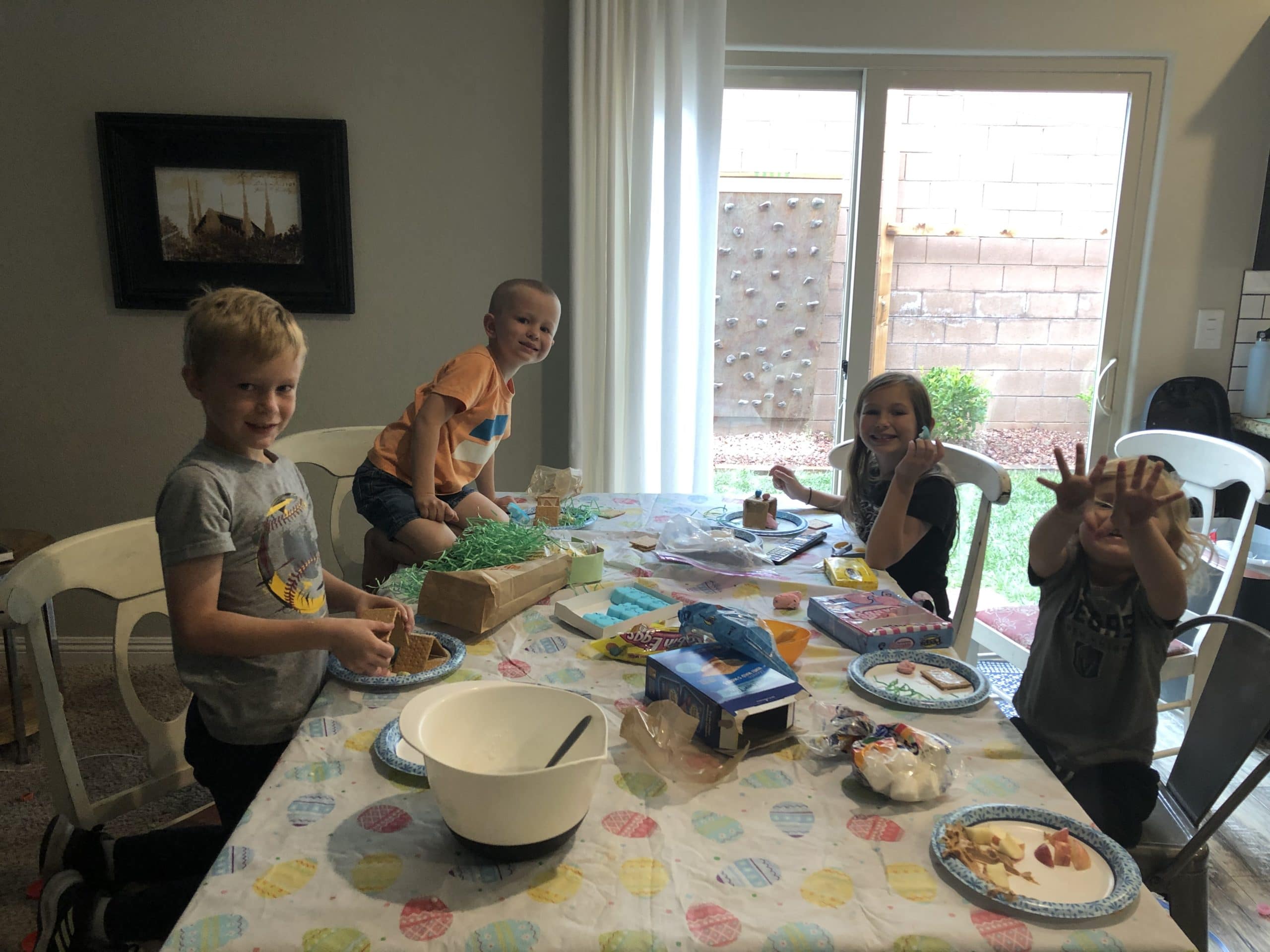 We had a great Easter even though we couldn’t do our fun traditions with family and friends. We colored eggs and made our own Easter dinner. It was fun to do our own thing this year. Grandma and Grandpa Eliason and Taylor hid eggs in the backyard late one night for the kids to find the next morning. They loved that! Some were hard to find! Then the next night Grandma and Grandpa England came over. Mom was going to secretly hide eggs in the front yard but when she got here we were all out! We got her a chair and all sat 6 feet away on the driveway. We ordered Cafe Rio and checked out their new car. It was fun to see them since we had only seen them once when we drove by in the past few weeks. The kids loved Easter morning and we tried to really focus on the Savior and reason for Easter.