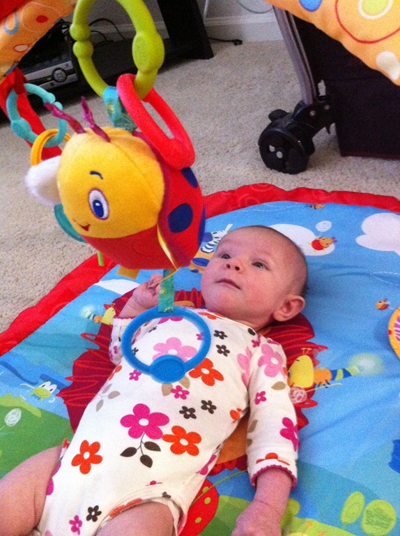 4. She’s starting to realize that toys are toys! She doesn’t really play yet, or hold on for long enough, but she stares and wonders and soon enough I am sure she will love the toys.