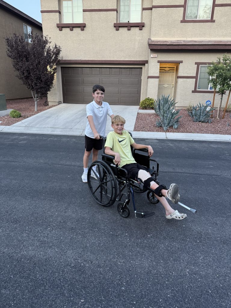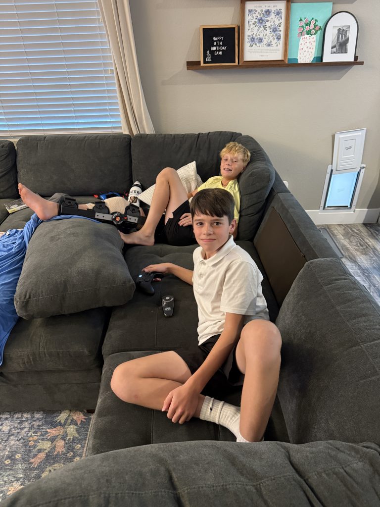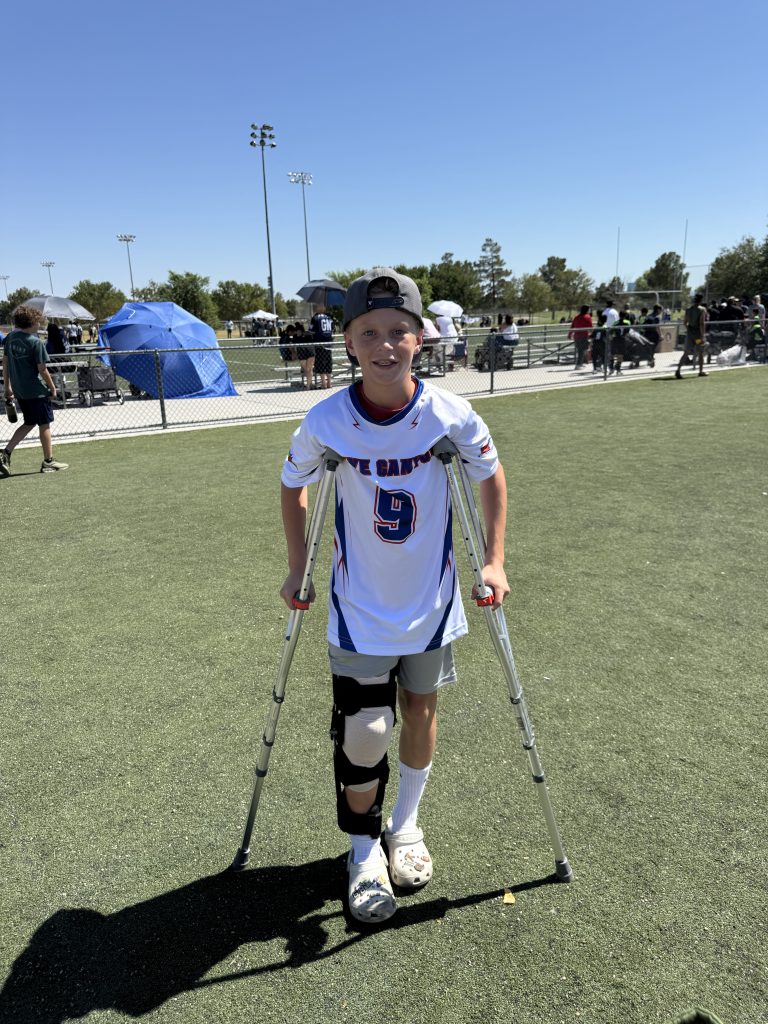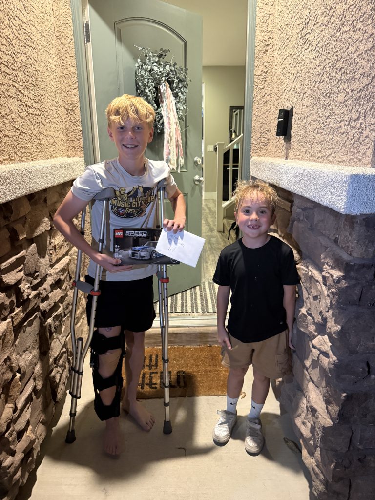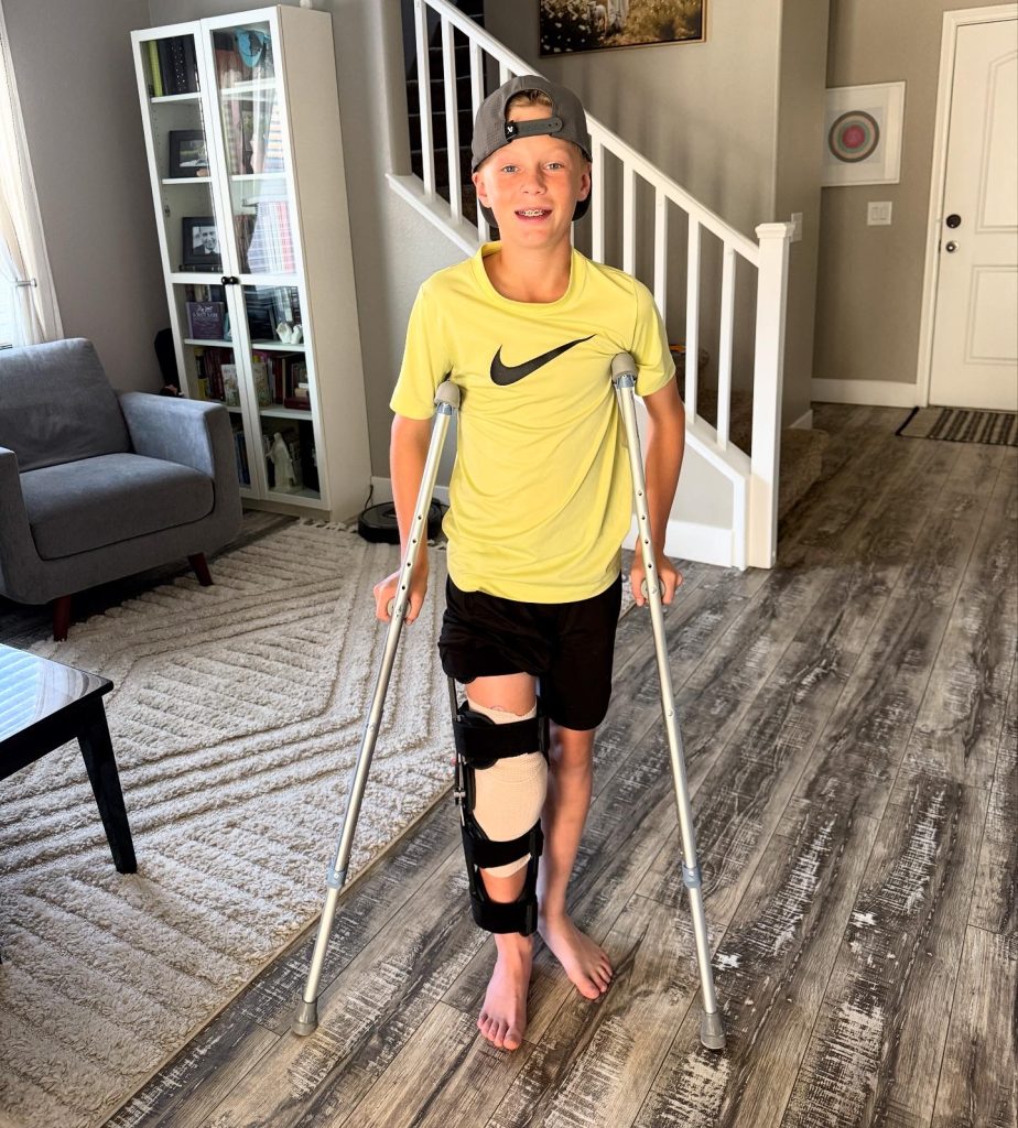 After Beau’s MRI right before his birthday, we found out that he needed to have knee surgery ASAP. His knee pain for the past two years was most likely not as much from the bone spur but more from some dead bone! The doctor said that needed to be fixed before it fell off. He would need to go in and screw the dead bone back in place, drill holes in the bone to stimulate blood flow and healing and he would also take the bone spur off. This would require Beau to be on crutches and a full leg brace for 6 weeks, physical therapy after 6 weeks and no sports or activities for 3-4 months. He had just started a new hockey season, just made the school Varsity football team and was about to try out for club volleyball so this wasn’t the news we wanted but we were also anxious to get it done and get him healing. He had surgery on September 11. He was out of it that night but by the next day was feeling good and has done so well with crutches or hopping around the house. He had lots of visitors, treats, and people checking in on him. I have to take him to school and pick him up and he has buddies in each class that help him leave early to get to his next class before the rush of kids, they carry his backpack and open the doors for him. He has been in good spirits too! He got to play in one football game where Coach Hubbard said the ball was going to Beau lots and he was playing the whole game since he’d be out the whole season. He was so sad to hear that he wouldn’t have Beau out there playing! Beau has been to the games on crutches cheering on his team! He played in one hockey game before surgery and will go to as many of those games as he can to cheer on that team as well. Impact Volleyball Club, who Kayli plays for and they know us well, took Beau for their 14U team along with Owen and Bennett so that will be fun. They knew about his surgery and that he would be out the first month and a half. He plans on going to those practices and watching but learning all that he can to be ready to jump in when the doctor clears him (hopefully in December!)